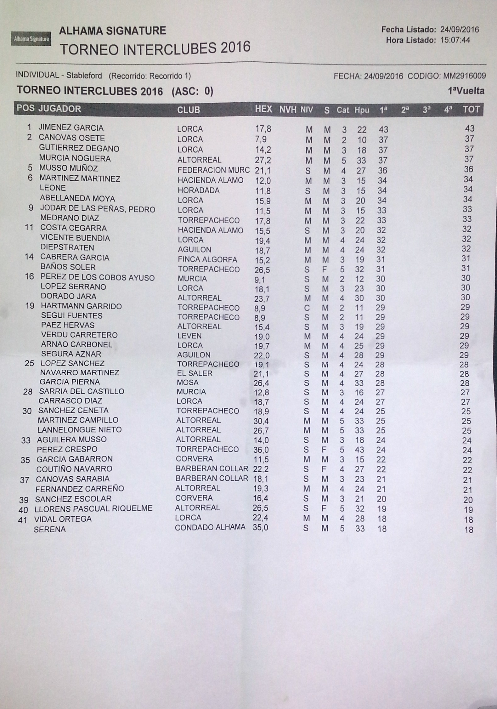 160924 ALH, Clasificación del torneo