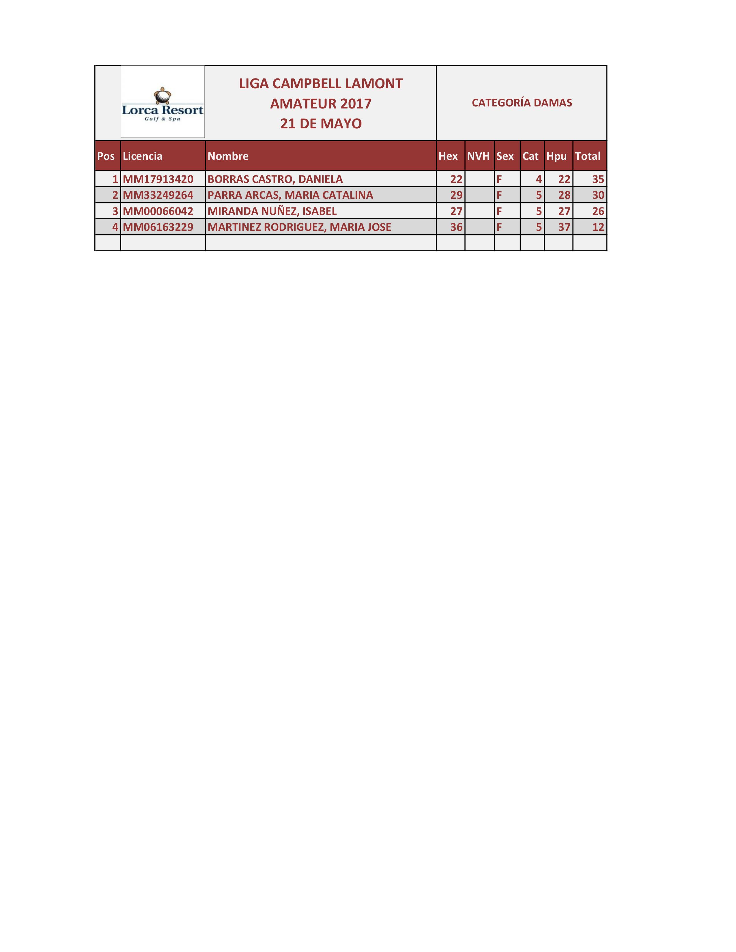 170521 LOR, Clasificación Categoría Damas