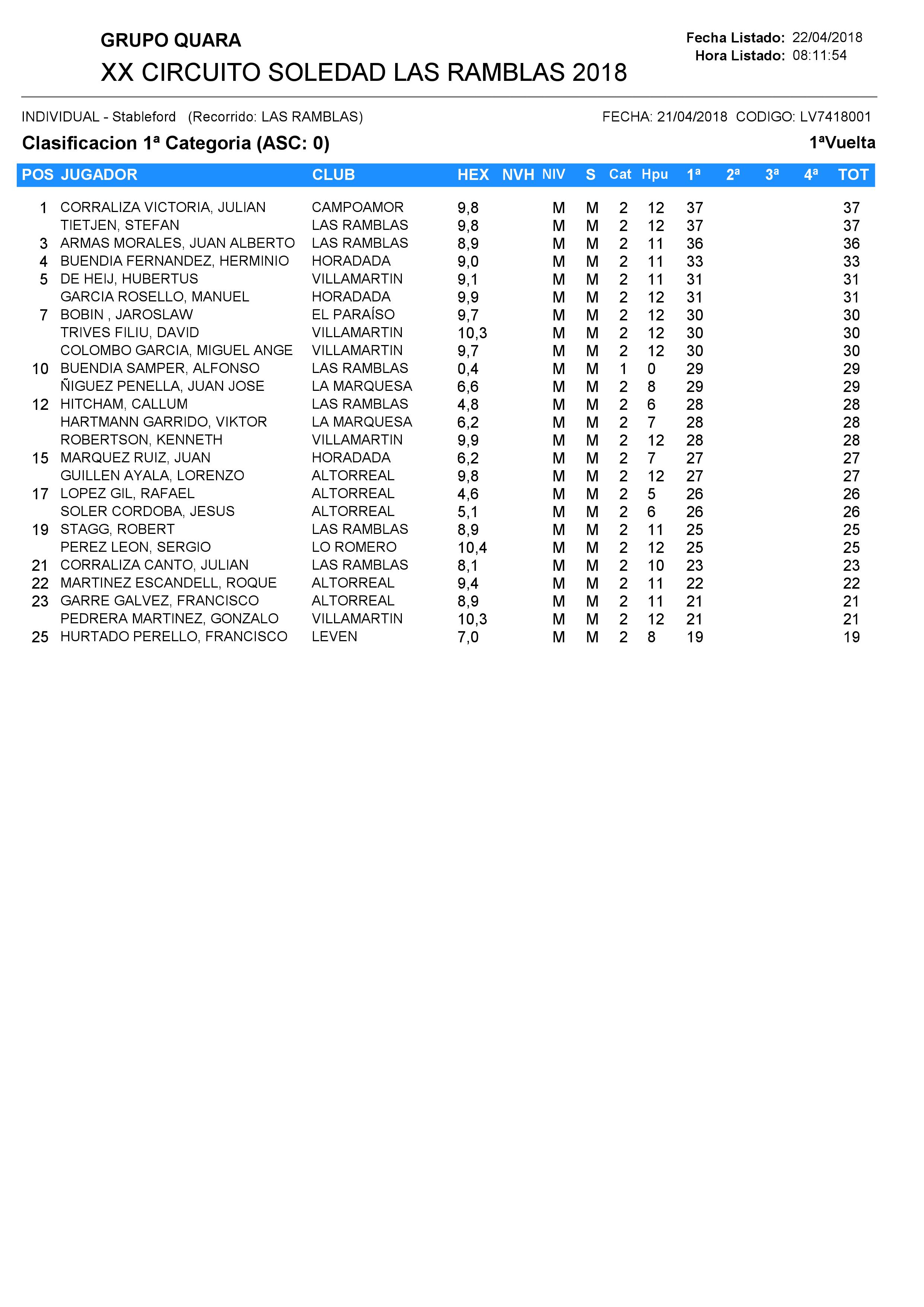 180421 RAM, Clasificación 1ª Categoría Caballeros