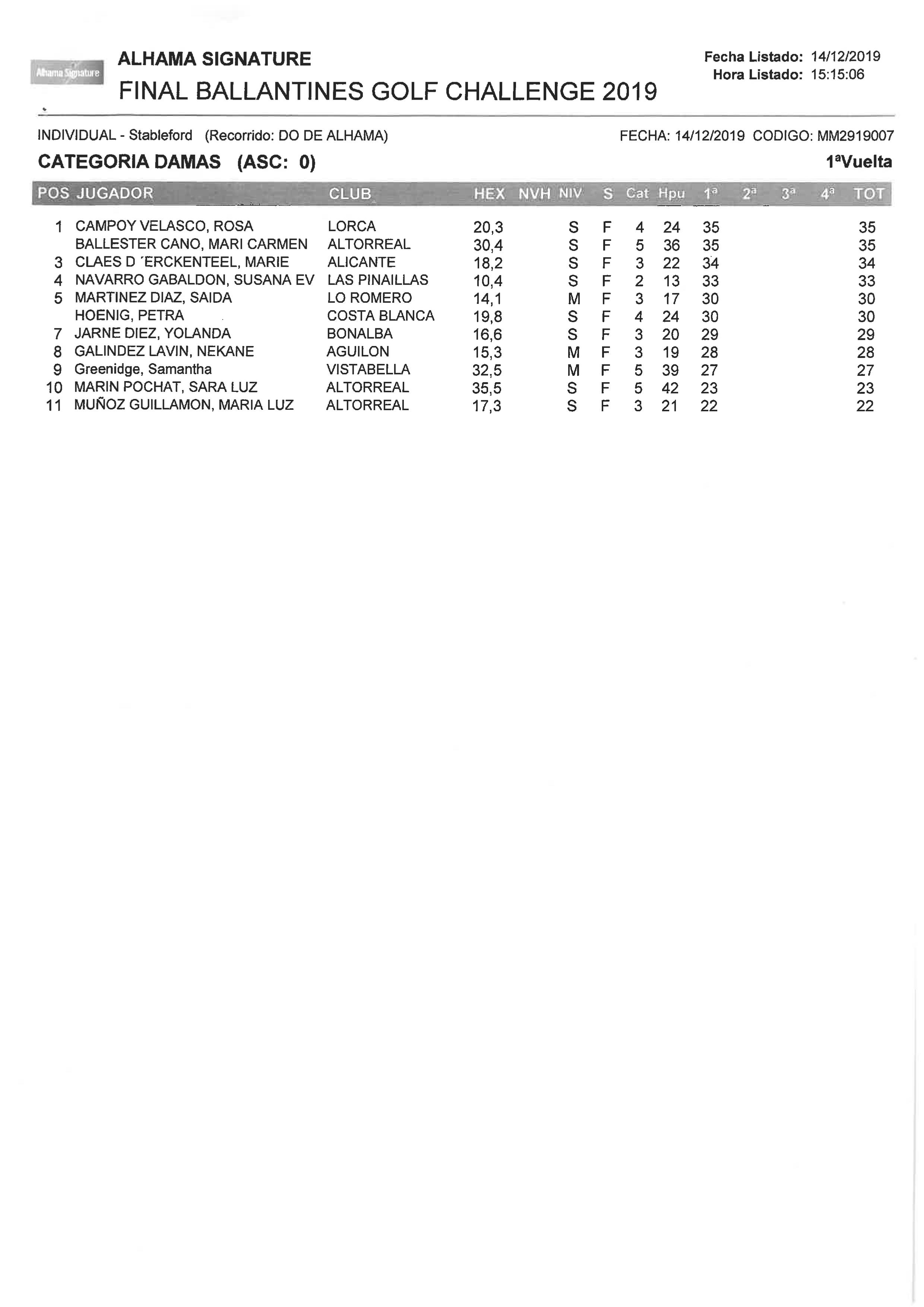 191214 ALH, Clasificación Categoría Damas