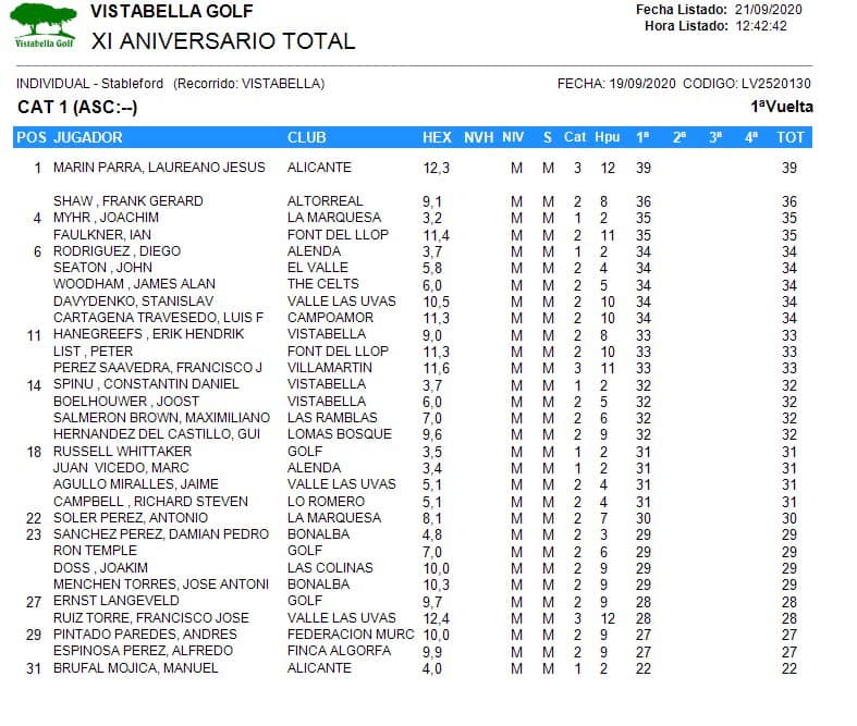 200919 VIS, Clasificación 1ª Cat. Caballeros