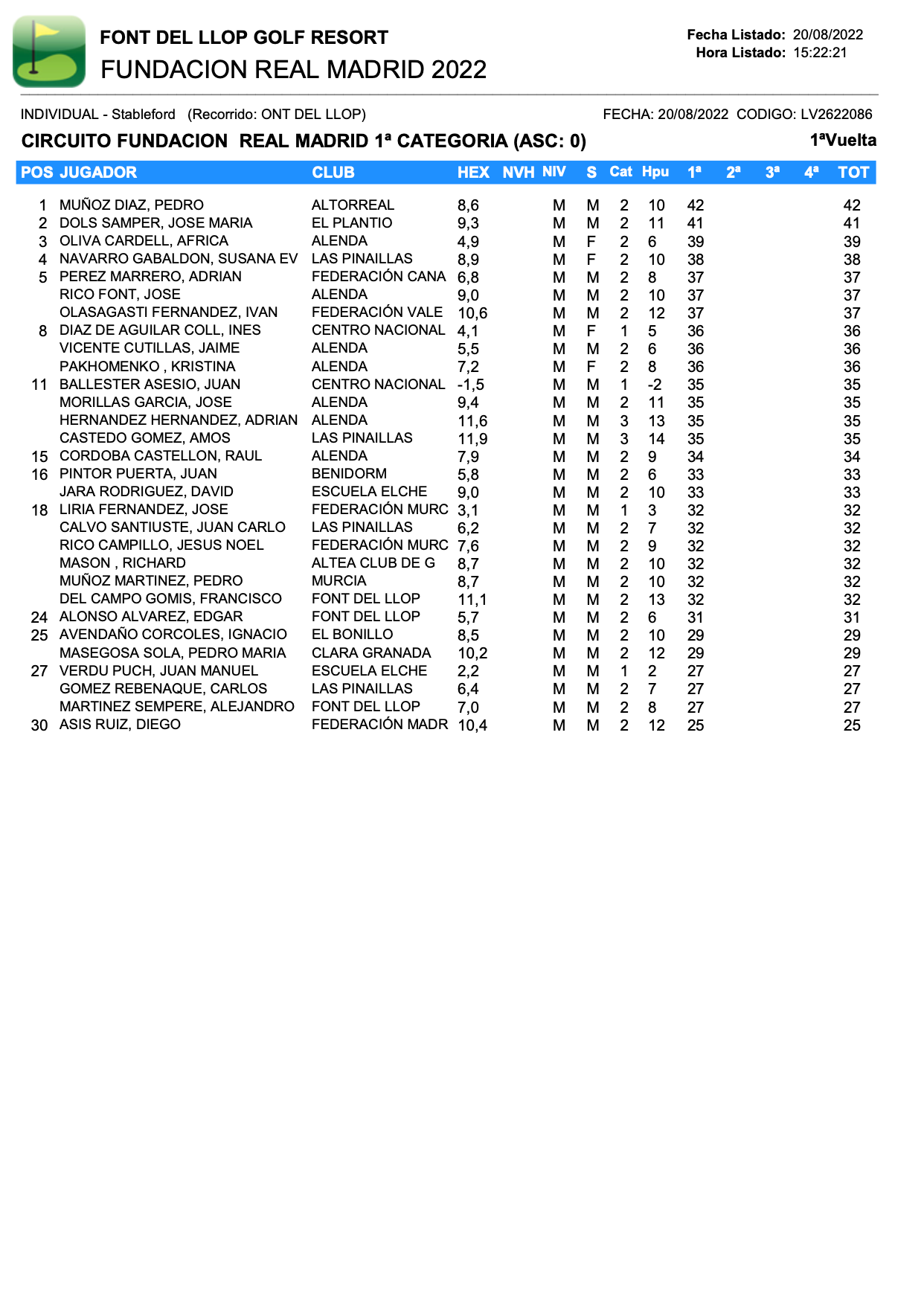 220820 FON, Clasificación 1ª Categoría