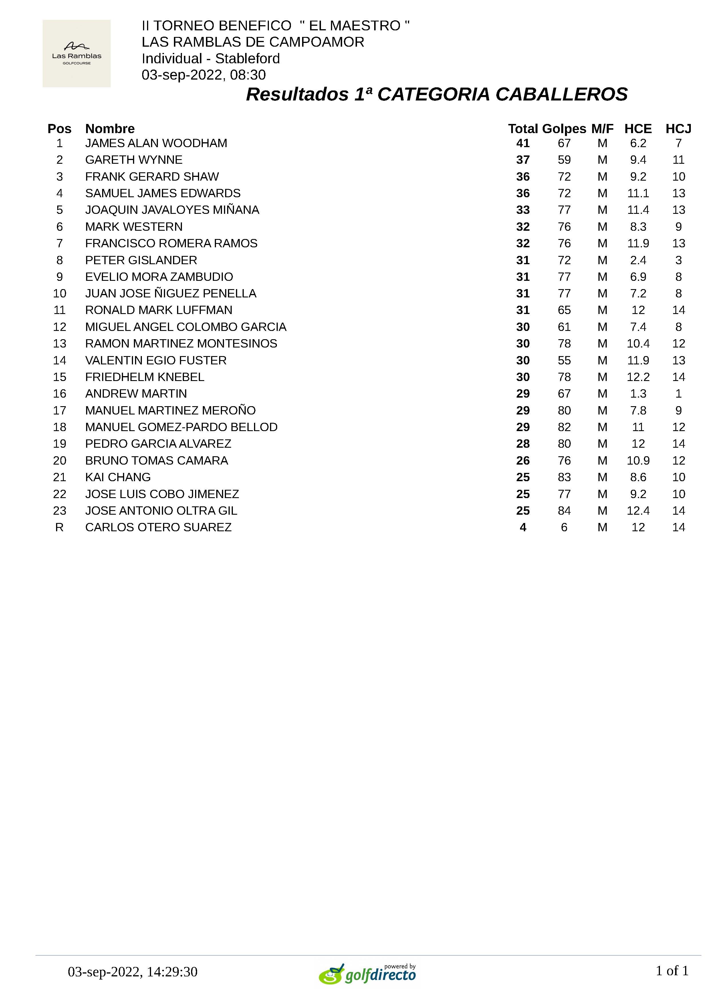 II TORNEO BENEFICO _ EL MAESTRO _ – Resultados 1ª CATEGORIA CABALLEROS 220903 RAM, Clasificación 1ª Categoría Caballeros