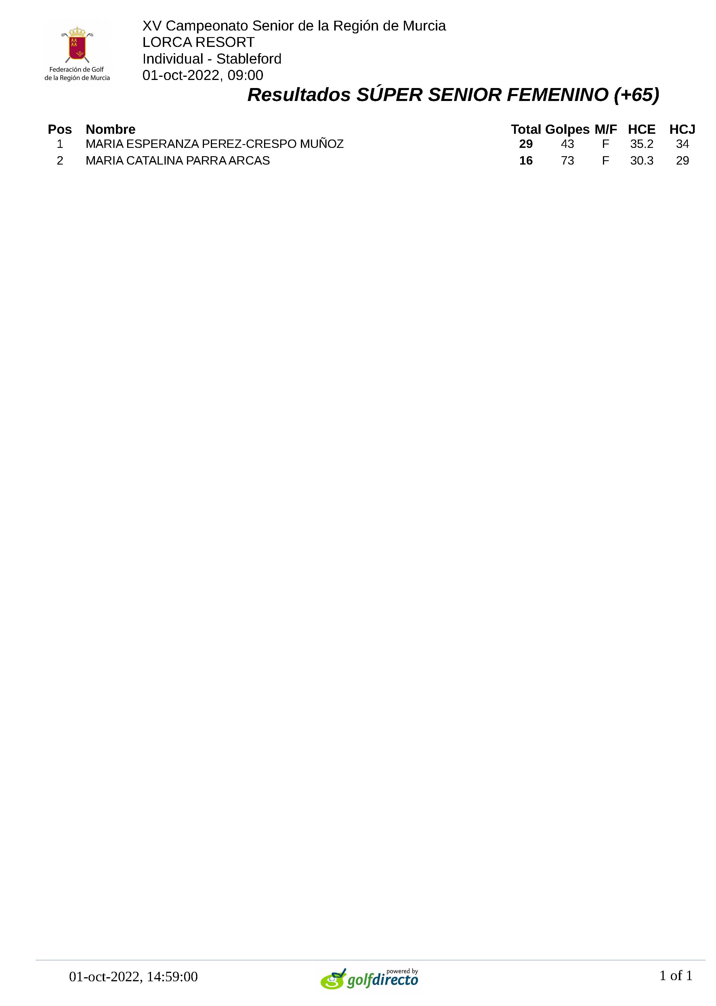221001 LOR, Clasificación Categoría Super Sénior de Damas 221001 LOR, Clasificación Categoría Super Sénior de Damas